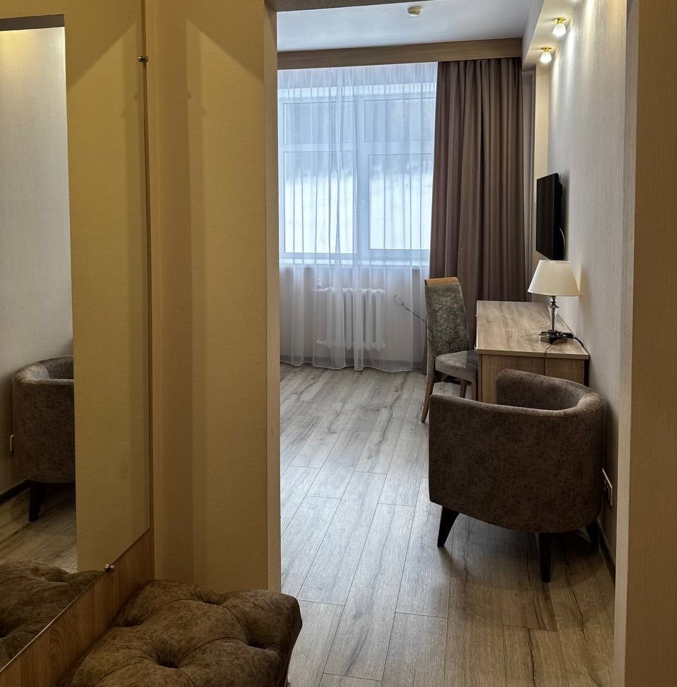 Комната, разделенная перегородкой: спальная зона (двуспальная кровать), зона отдыха с диваном и журнальным столиком. Туалетная комната с душевой кабиной.