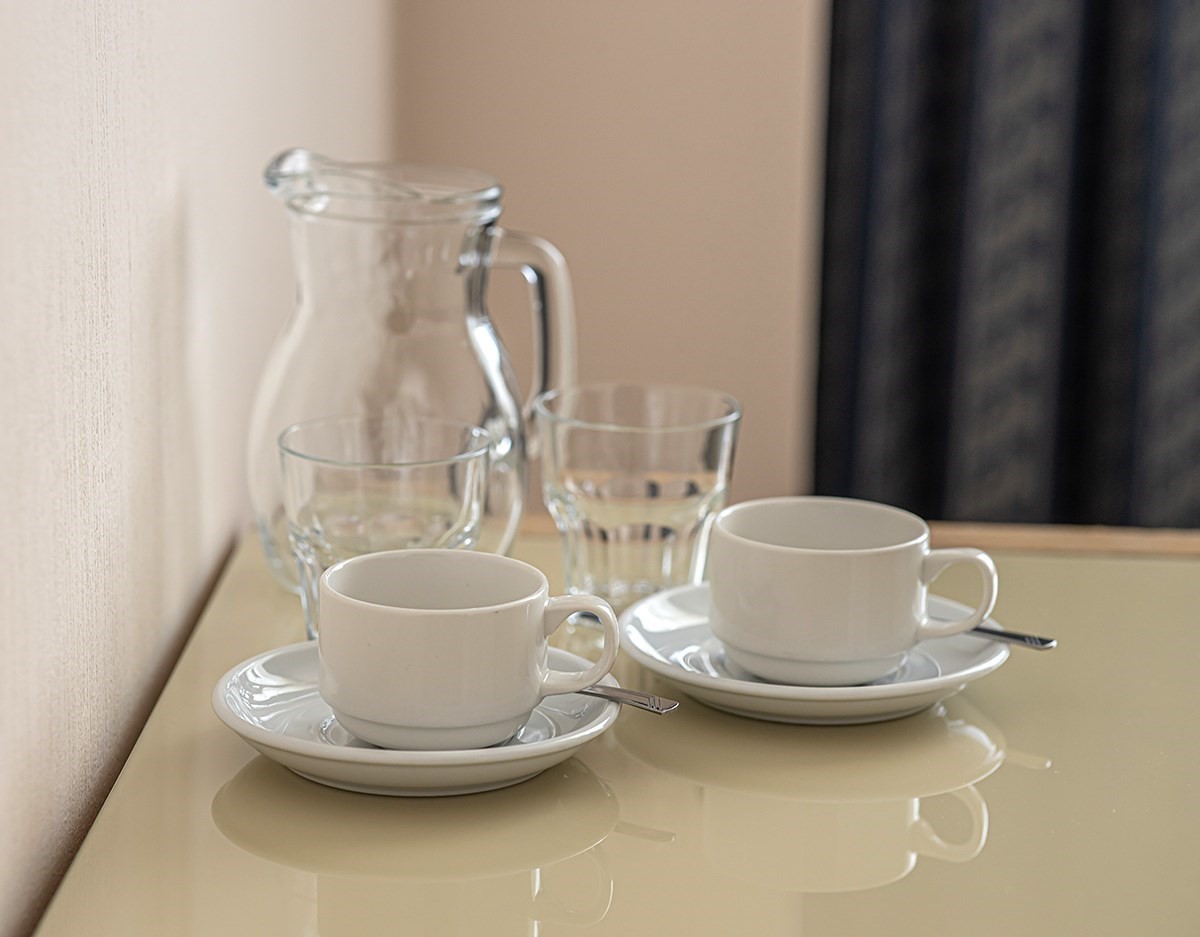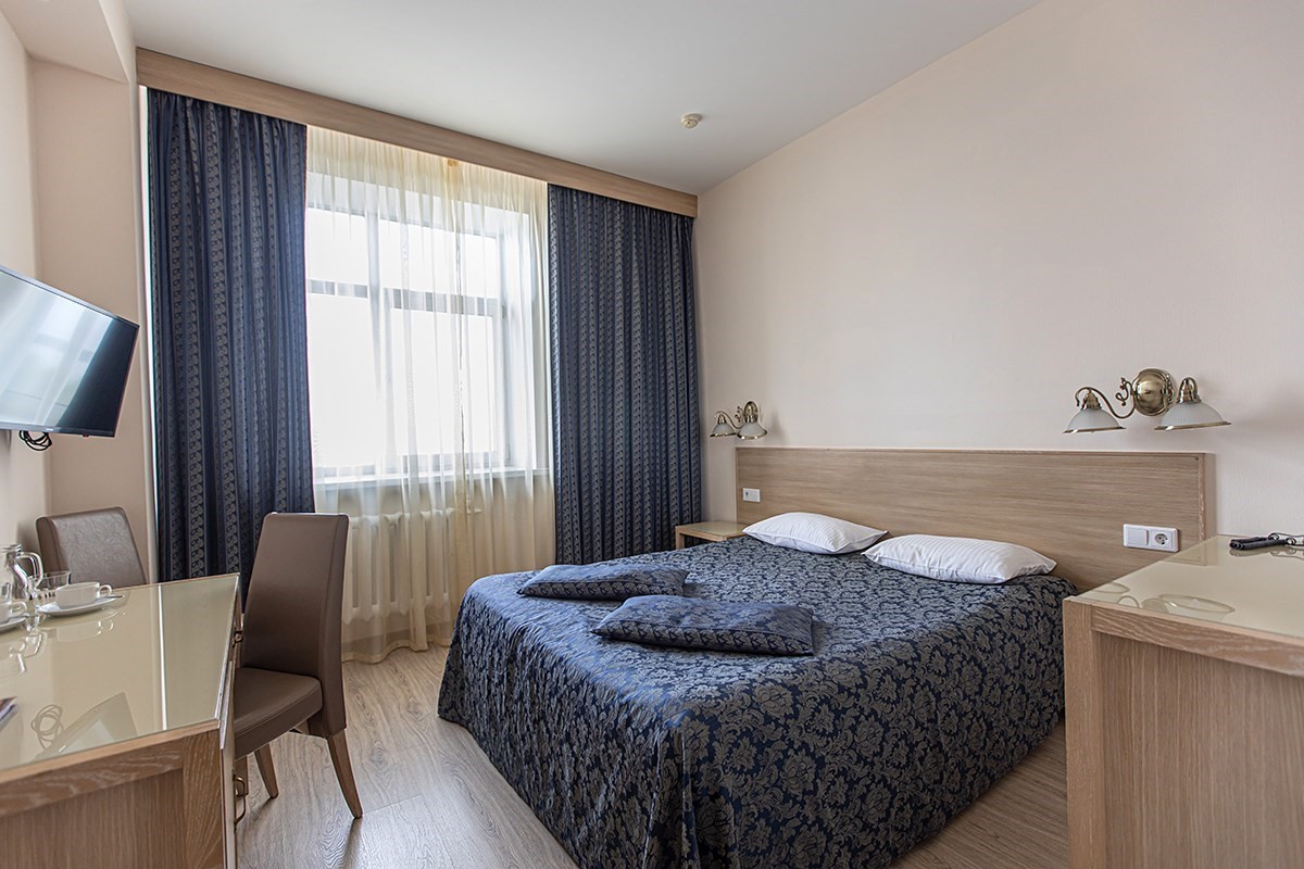 Однокомнатный. Одна двуспальная кровать либо кровать-трансформер (трансформируется в двуспальную или в две односпальные), туалетная комната с душевой кабиной.