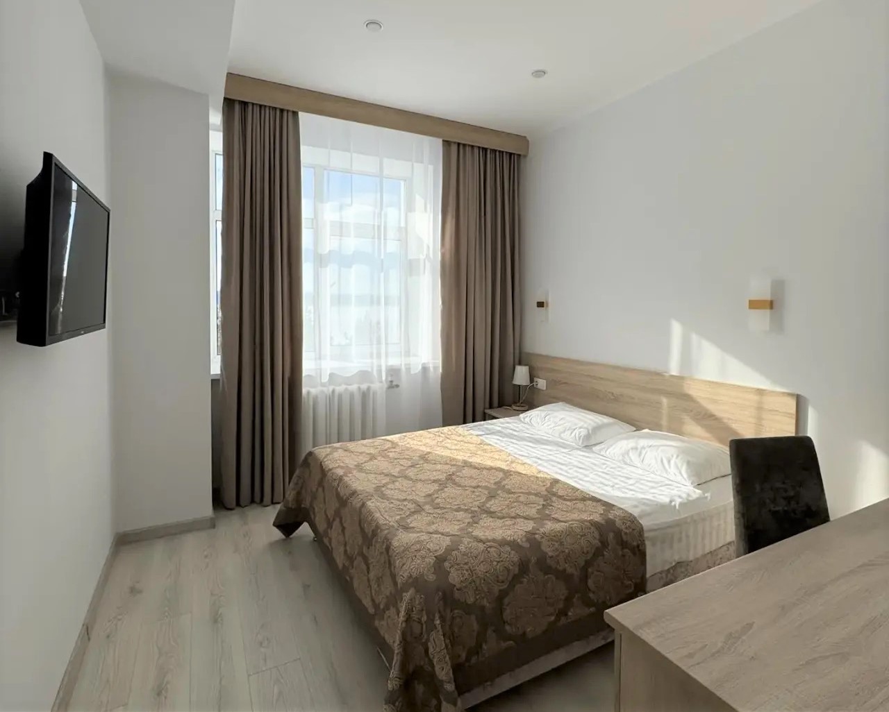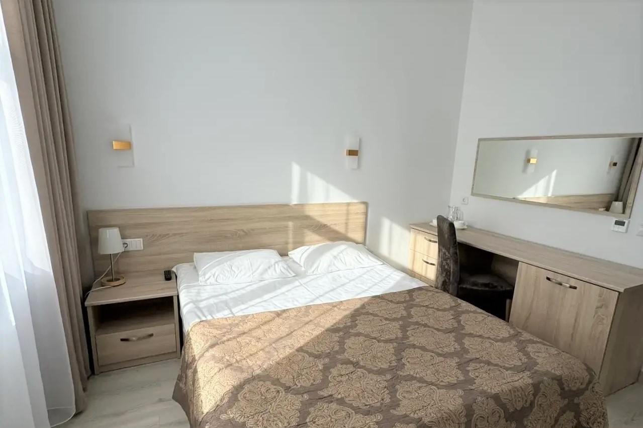 Однокомнатные номера с одной двуспальной кроватью, туалетная комната с душевой кабиной.