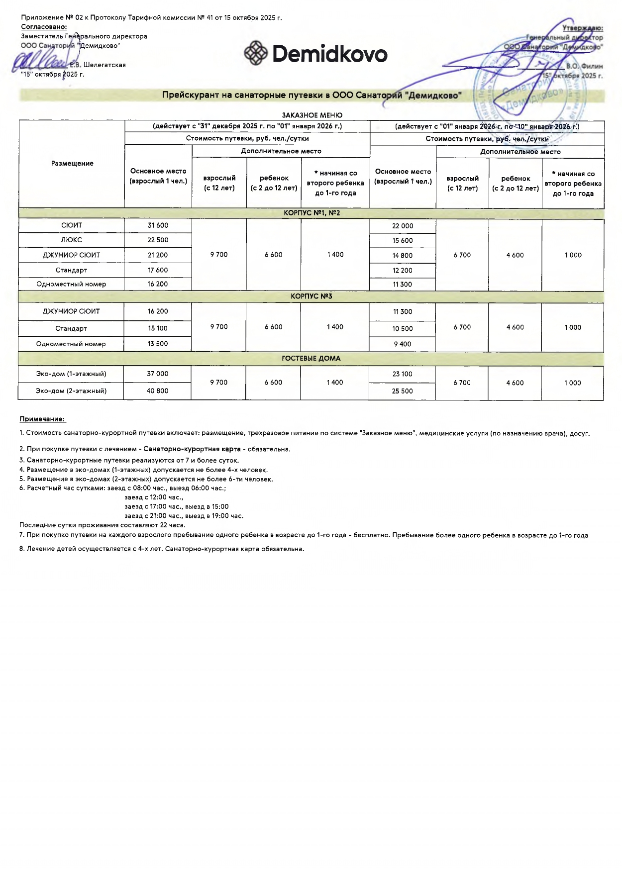 1. Стоимость программ (санаторно-курортных путевок) включает размещение, питание по системе "Заказное меню" и медицинские услуги (по назначению лечащего врача).