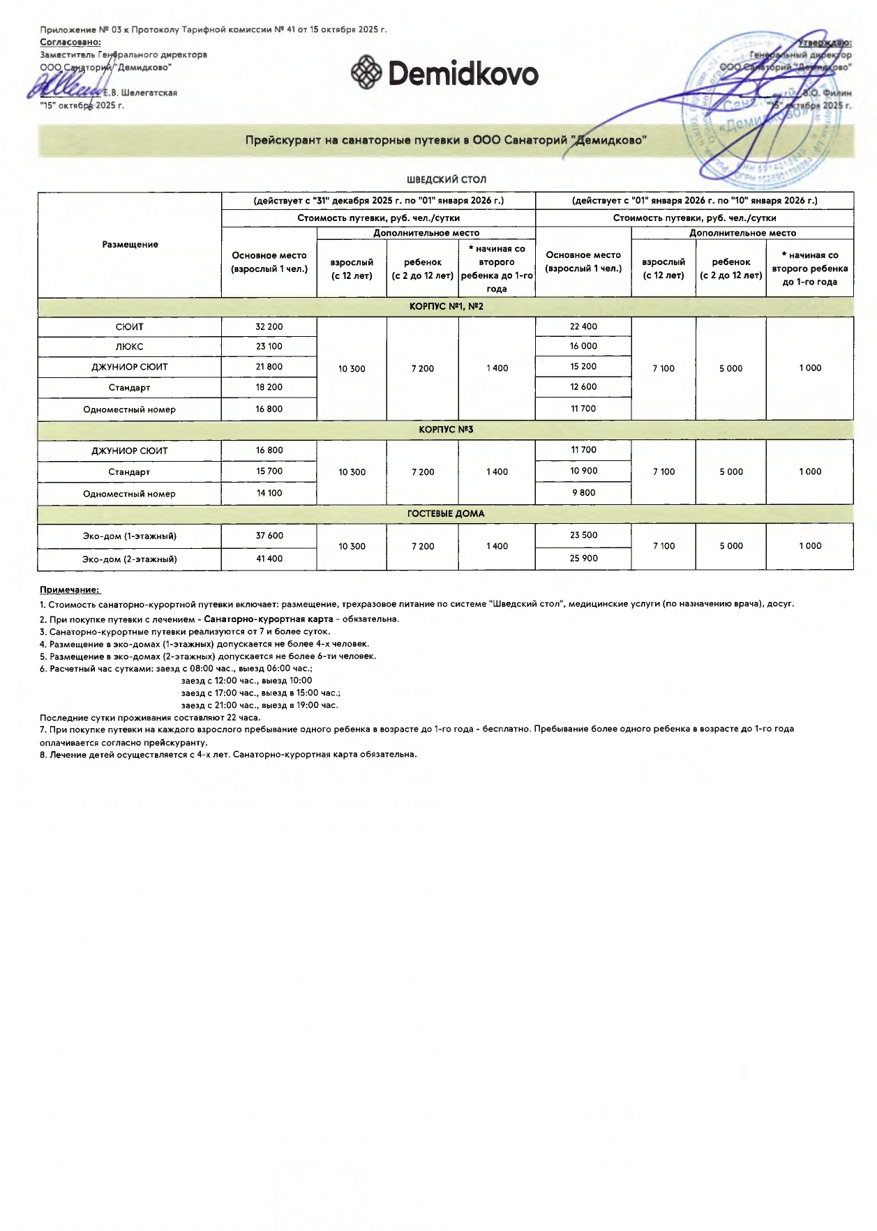 1. Стоимость программ (санаторно-курортных путевок) включает лечение, питание по системе "Заказное меню" и проживание. При переходе на питание по системе "Шведский стол" стоимость за сутки увеличивается на 300 рублей / чел.
