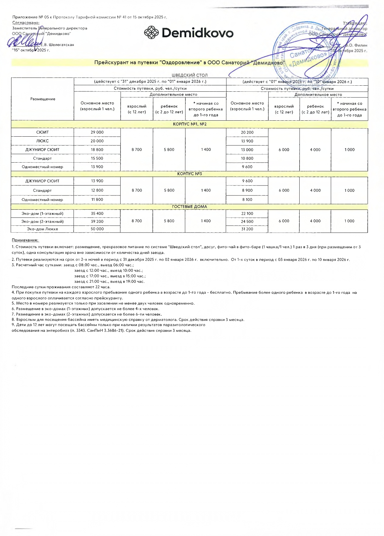 1. Стоимость путевки включает: размещение, пятиразовое диетическое питание, досуг, посещение бассейна с комплексом саун 1 раз в 3 дня (при размещении от 3 суток), по предварительной записи (1 час), фито-чай в фитобаре (1 чашка/1 чел.) 1 раз в 3 дня (при размещении от 3 суток), одна консультация врача (20 минут) вне зависимости от количества дней заезда.