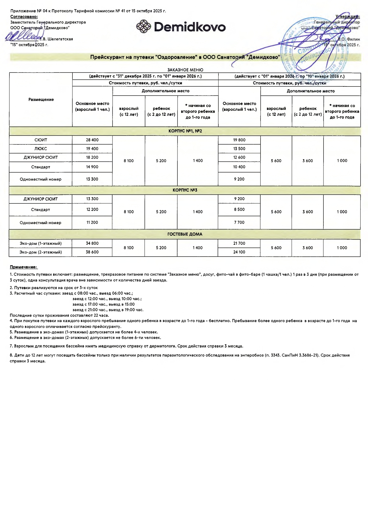 1. Стоимость путевки включает: размещение, трехразовое питание по системе "Заказное меню", досуг, посещение бассейна с комплексом саун 1 раз в 3 дня (при размещении от 3 суток), по предварительной записи (1 час), фито-чай в фитобаре (1 чашка/1 чел.) 1 раз в 3 дня (при размещении от 3 суток), одна консультация врача (20 минут) вне зависимости от количества дней заезда.